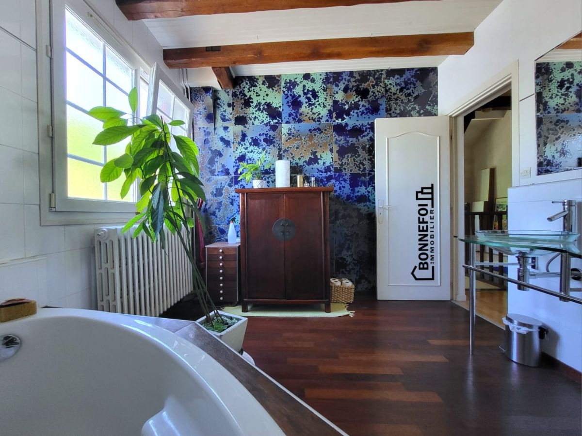 Au premier étage, un élégant escalier en bois vous conduit à un spacieux palier pouvant servir de coin détente, bibliothèque ou bureau. Trois grandes chambres vous y attendent, ainsi qu’un dressing facilement transformable en chambre d’enfant ou en bureau grâce à la création d’un vélux. Une vaste salle de bains avec double vasque et WC complète ce niveau.