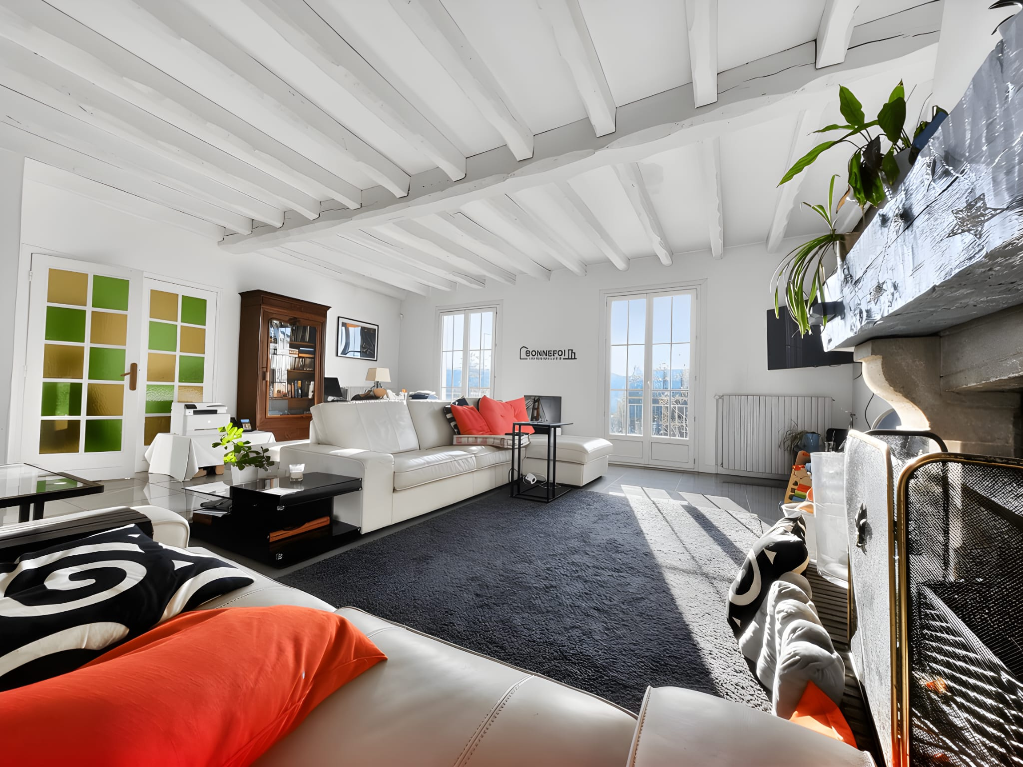 Au 1er étage une entrée avec rangements, 2 chambres, un espace de vie traversant de plus de 63m² avec cheminée donnant accès sur la terrasse exposée OUEST.